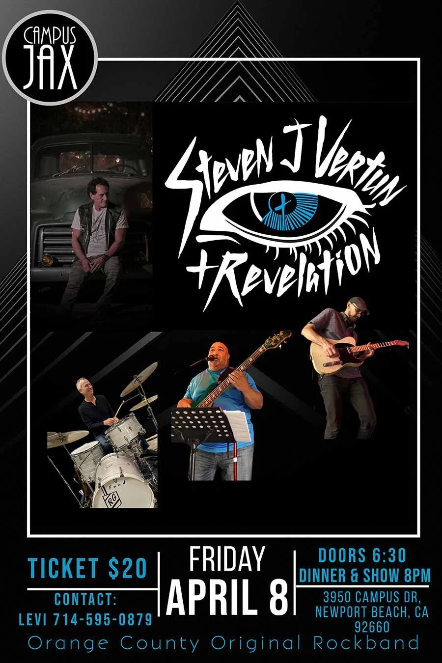 “Steven J. Vertun and Revelation” is an original rock band performing songs crafted over several decades. The bands founder, Steven J. Vertun is a lifelong musician/song writer formerly the lead of the band “Eye Savant”, which played and entertained in Southern California’s best venues for 20 years. In 2017 he took the year to craft 24 new songs before building his latest band, Revelation.